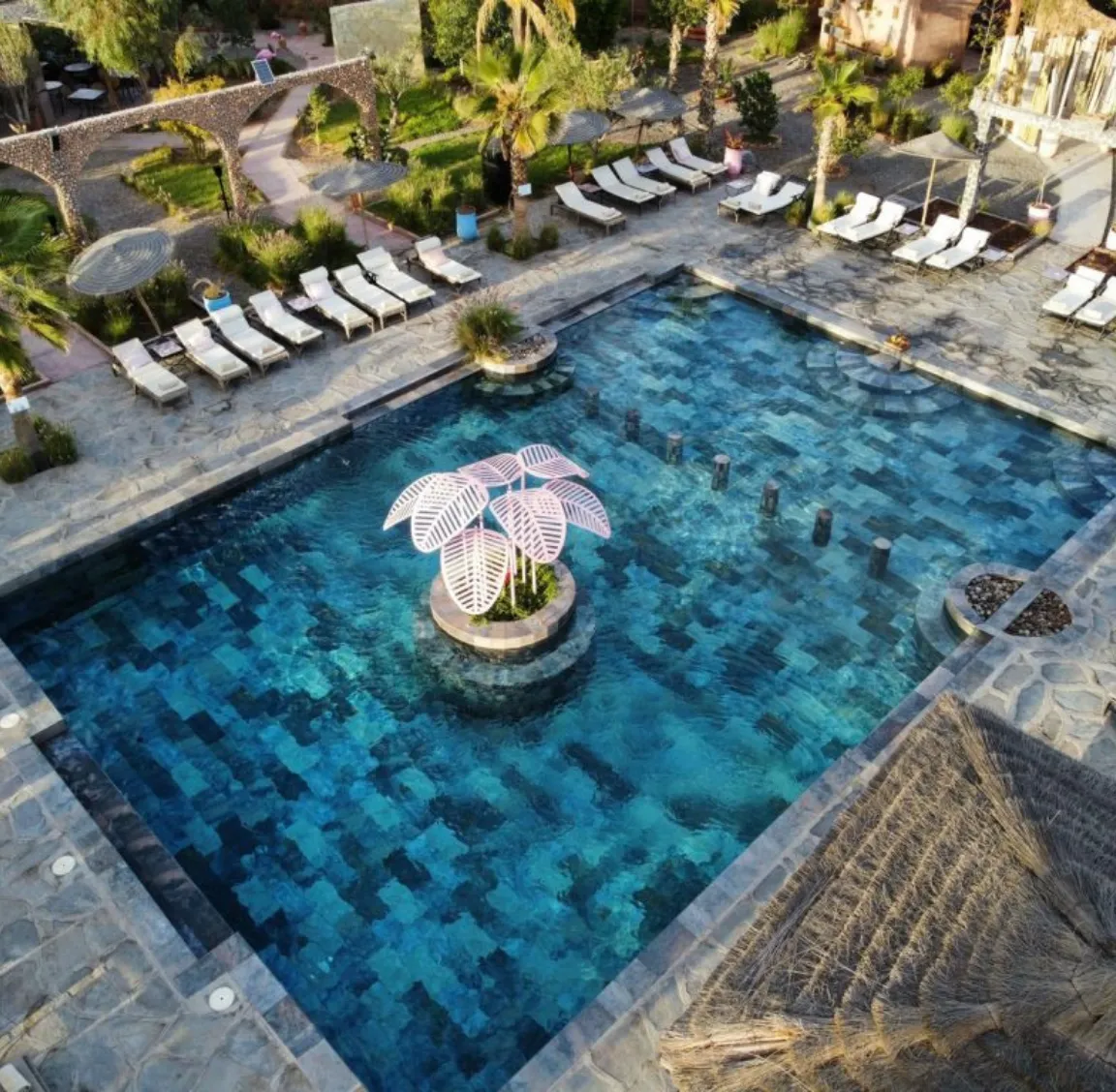 The venue features a large outdoor swimming pool with sun loungers and shaded seating areas, creating a comfortable environment to cool off during warm Marrakech days. The atmosphere is casual and welcoming, making it suitable for both adults and children.