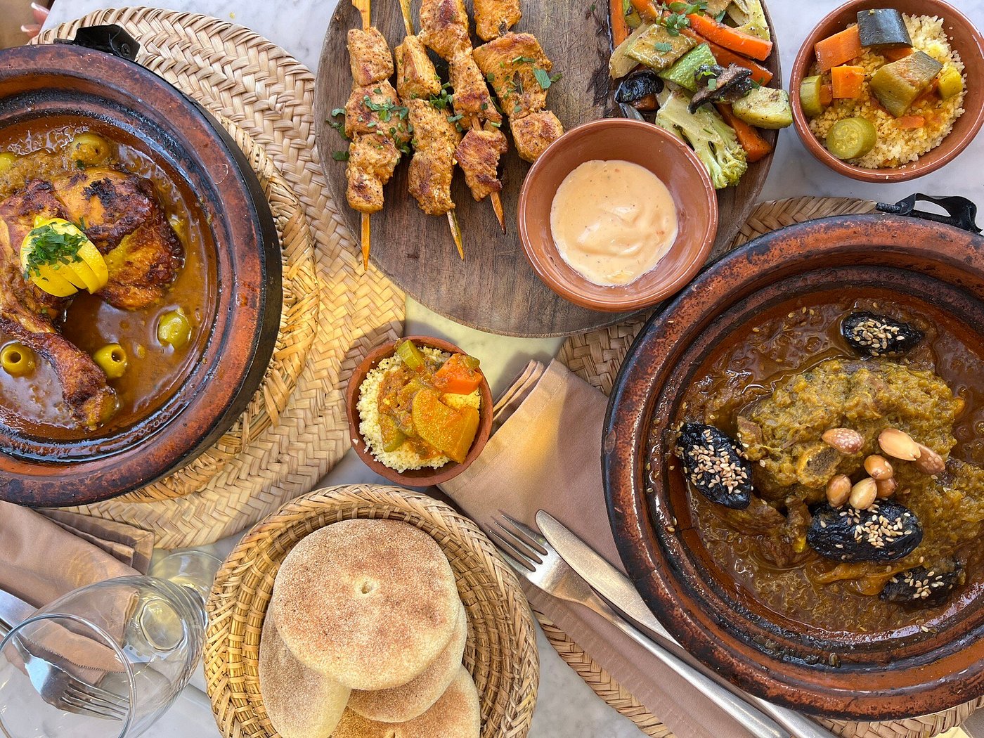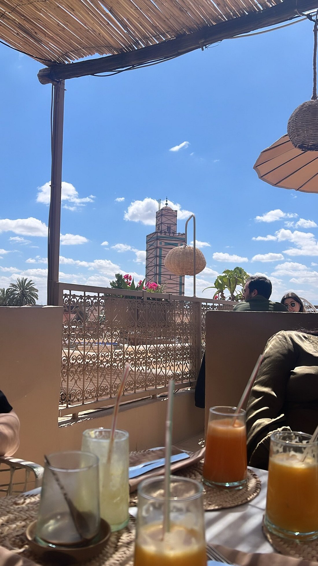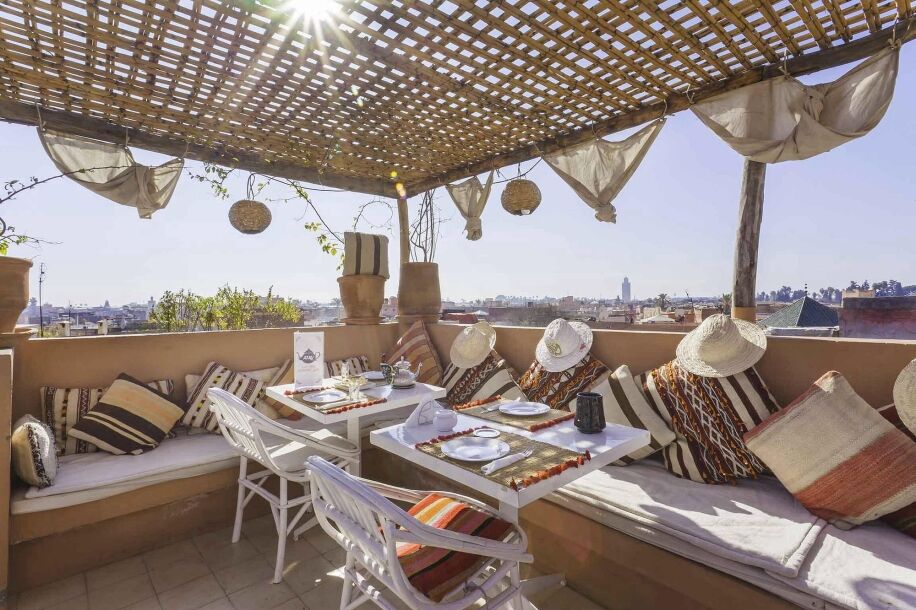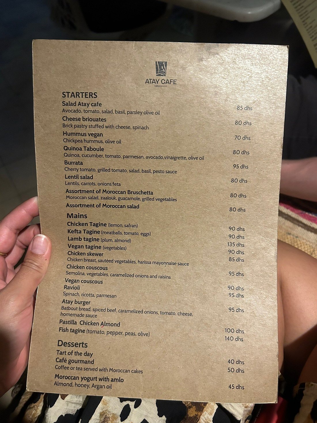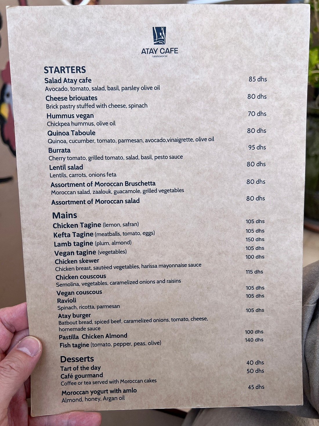 Atay Cafe is a popular rooftop café and restaurant in the Medina of Marrakech. It offers Moroccan and Mediterranean food, salads, tagines, and light meals. You can also enjoy tea, coffee, sweets, and drinks with a view of the old city.